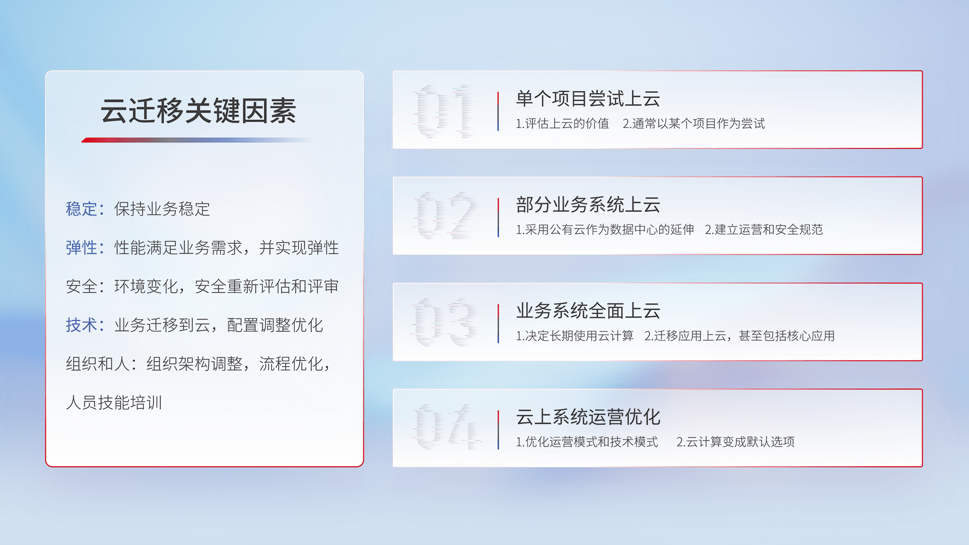 结合实际业务,,,,从规划设计、、云平台选型、、、云原生改造、、数据迁移、、、集成交付,,迁移全过程为客户识别最佳上云路径,,,,做好风险识别管理,,,设计网络架构、、、、身份权限、、、安全审计合规、、操作审计、、、、日志审计、、、、监控告警策略、、、、多站点容灾设计等,,对云上基础设施进行整体规划,,,,提升IT治理水平,,以满足弹性、、、、高可用、、、、高性能的需求。。。。