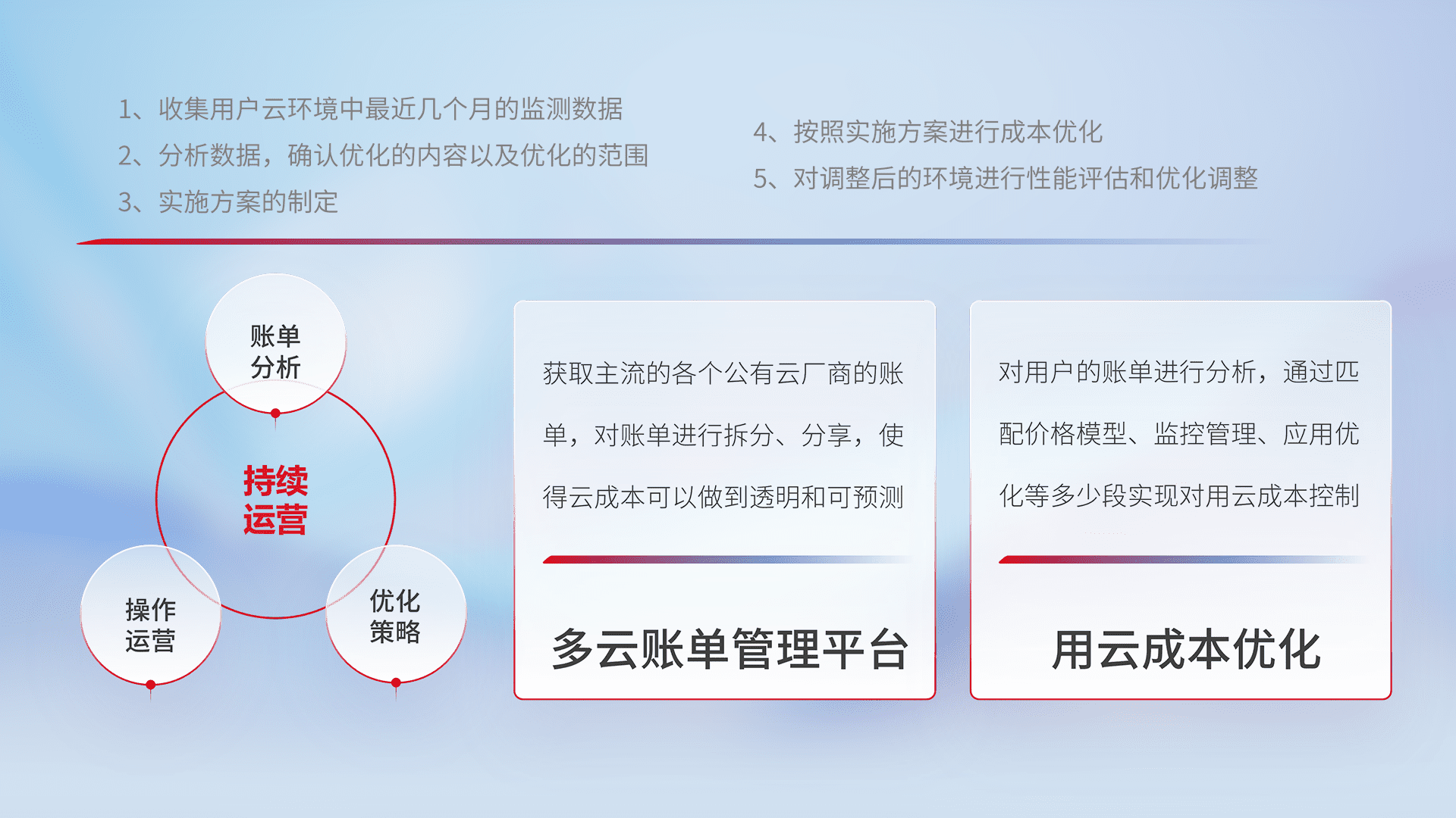 通过多云纳管,,,,以统一的资源数据模型把客户的云资源进行抽象和封装,,,进而实现对多云资源的统一操作,,,保障云资源管理的可靠性、、稳定性与可用性。。。。量身定制化运维内容,,,,配置、、开发运维、、、补丁管理、、、、备份、、、、监控、、、认证和访问管理、、、、审计和日常巡检等,,,保障在用云过程中的可靠度,,稳定度以及高可用率。。。。